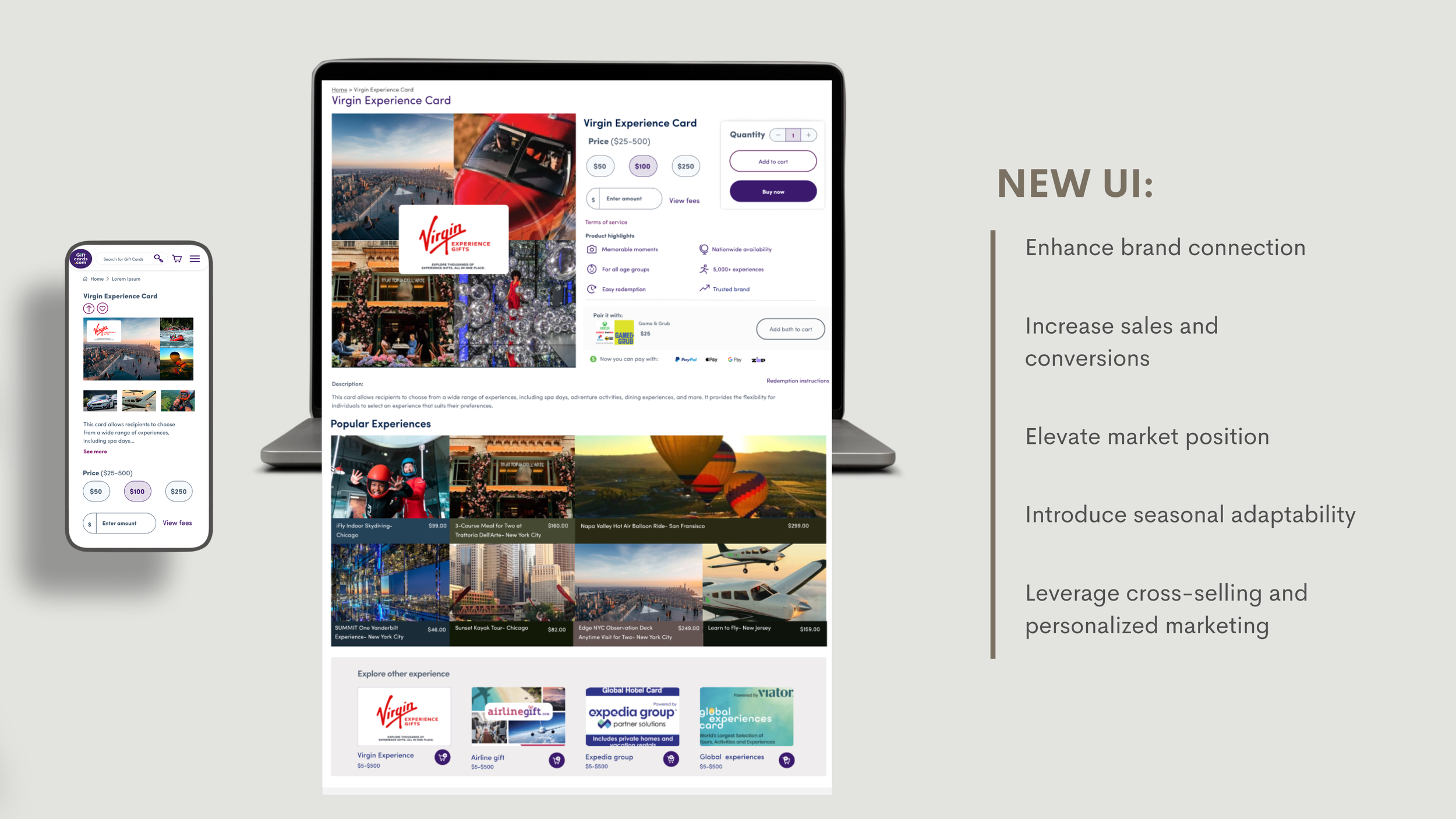 By shifting the Virgin Experience PDP from a product-focused page to an experience-first journey, GiftCards.com positioned itself to meet modern consumer demand for memories over material goods. The redesign addressed stakeholder goals, resolved usability gaps, and drew from best-in-class competitor practices to create a scalable, future-proof approach. Most importantly, it reframed the gift card as a gateway to unforgettable experiences—fully aligned with the evolving market and Way’s mission to empower brands through the power of experiences.